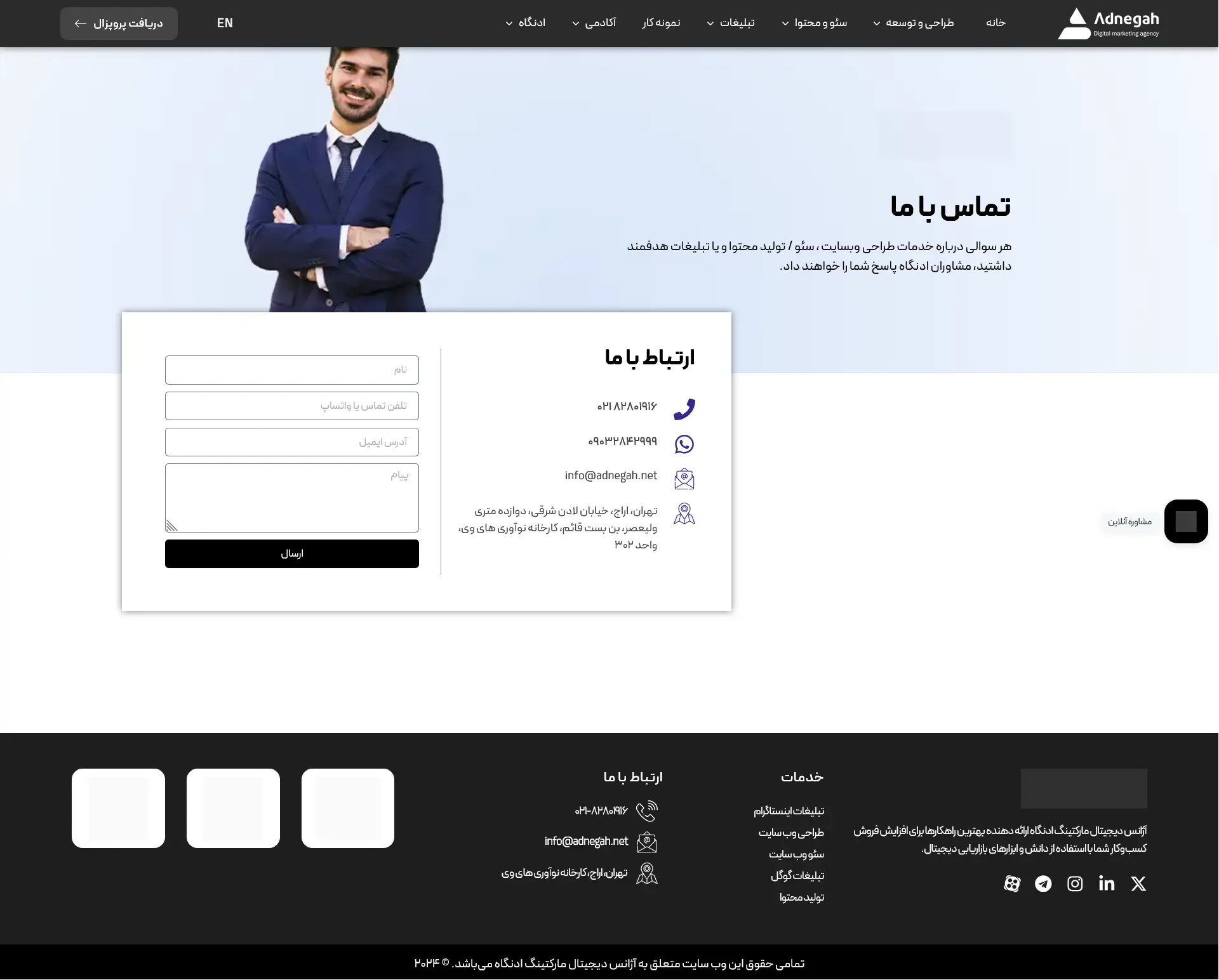 در پروژه طراحی وبسایت «ادنگاه» — آژانس خلاق دیجیتال مارکتینگ — تمرکز ما بر ایجاد هویتی دیجیتال منسجم، مدرن و کاربرپسند بود. طراحی سایت با در نظر گرفتن نیازهای یک آژانس حرفهای مارکتینگ انجام شد؛ شامل صفحات خدمات، نمونهکارها، بلاگ آموزشی و فرمهای جذب مشتری. استفاده از رنگبندی هدفمند، تایپوگرافی حرفهای و انیمیشنهای نرم باعث شده تجربه کاربری جذابی شکل بگیرد که برند ادنگاه را بهخوبی معرفی میکند. این سایت بهطور کامل واکنشگرا بوده و با رعایت استانداردهای فنی سئو پیادهسازی شده است.