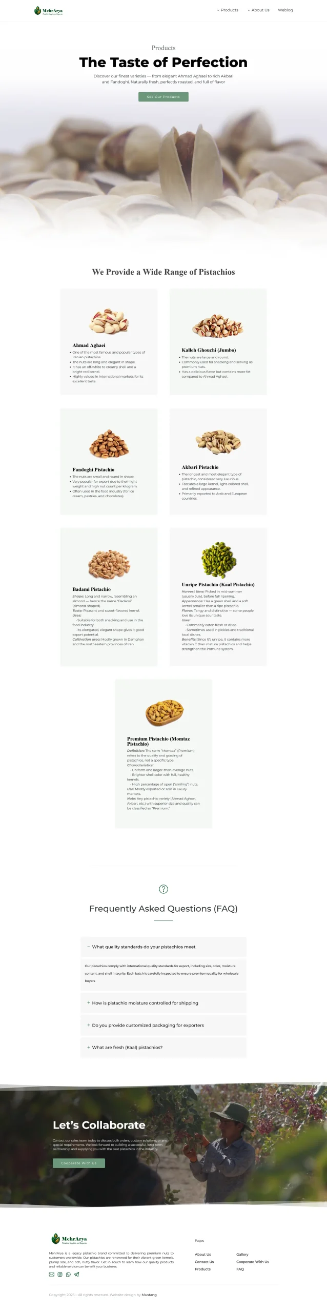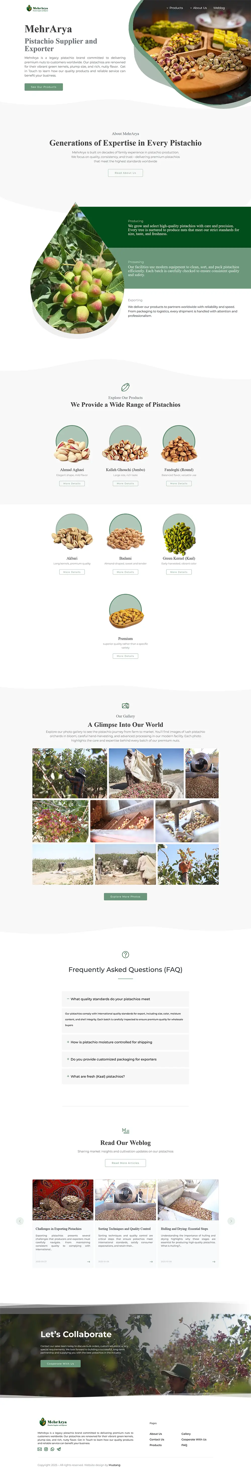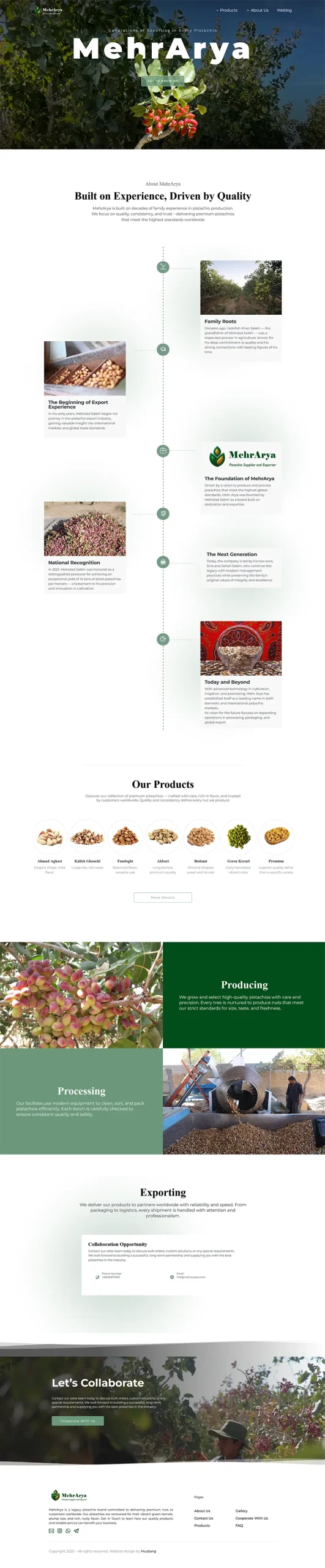 سایت مهرآریا بهعنوان تولیدکننده و صادرکنندهی برتر پسته، با طراحی مدرن و کاربرپسند، تجربهای دلنشین از خرید و آشنایی با محصولات پسته را برای کاربران فراهم میکند. در این وبسایت، بازدیدکنندگان میتوانند بهراحتی با انواع محصولات، فرآیند تولید و اطلاعات صادراتی آشنا شوند و با طراحی واکنشگرا، تجربهای یکپارچه در دستگاههای مختلف، از موبایل تا دسکتاپ، داشته باشند. هدف این طراحی، ارائهی تصویری حرفهای از برند مهرآریا و افزایش اعتماد مشتریان داخلی و بینالمللی به کیفیت محصولات بوده است.
