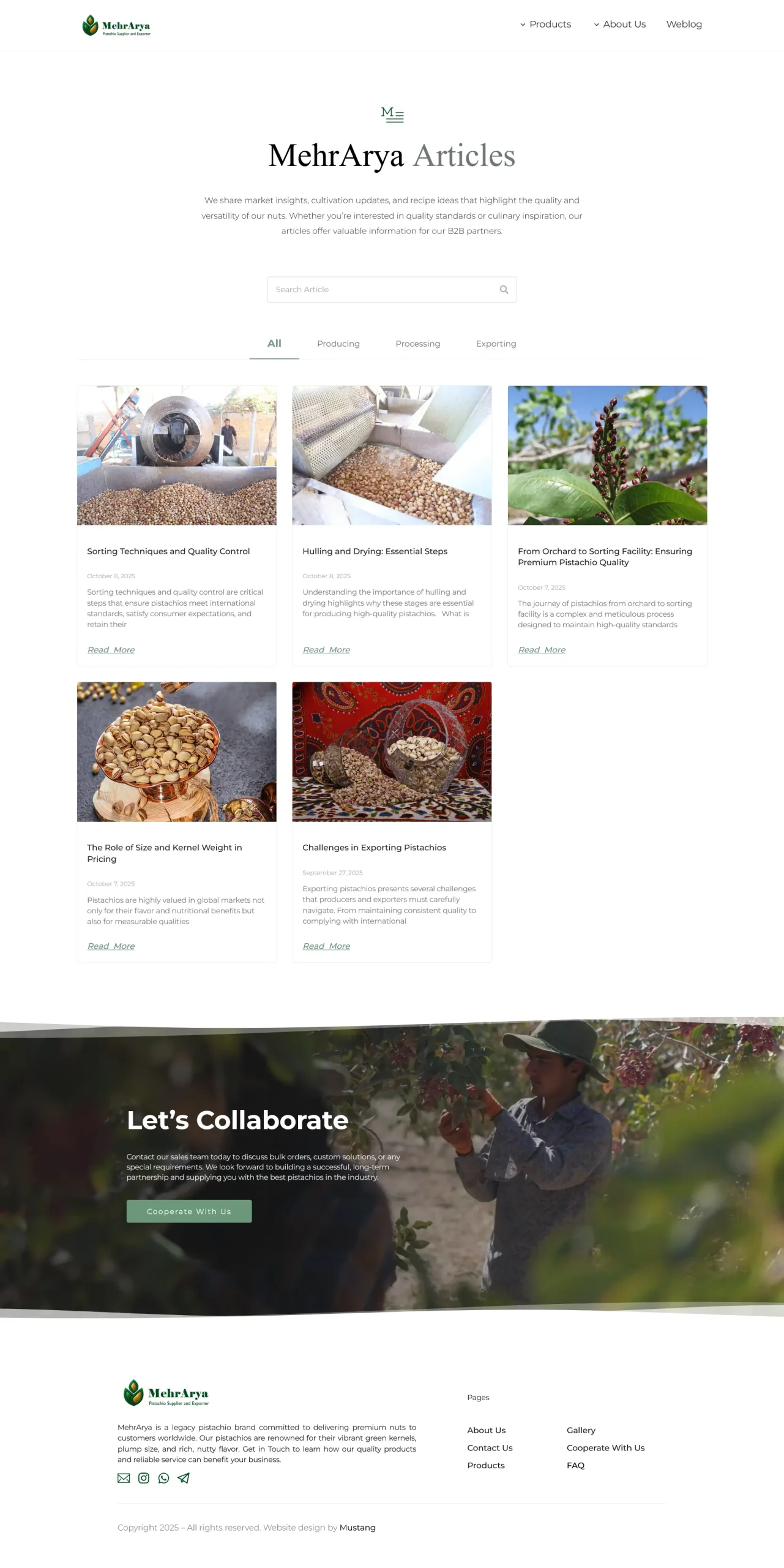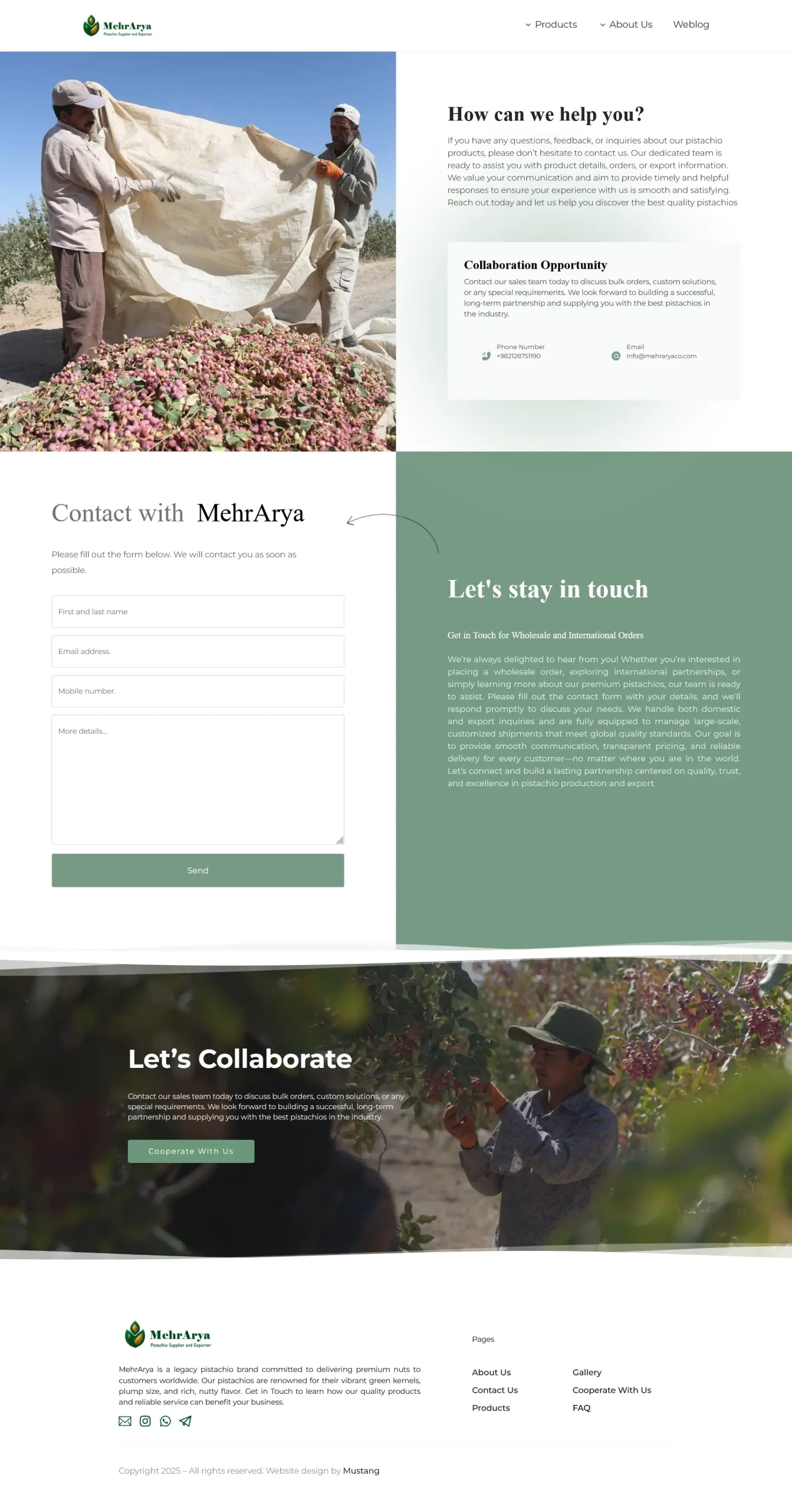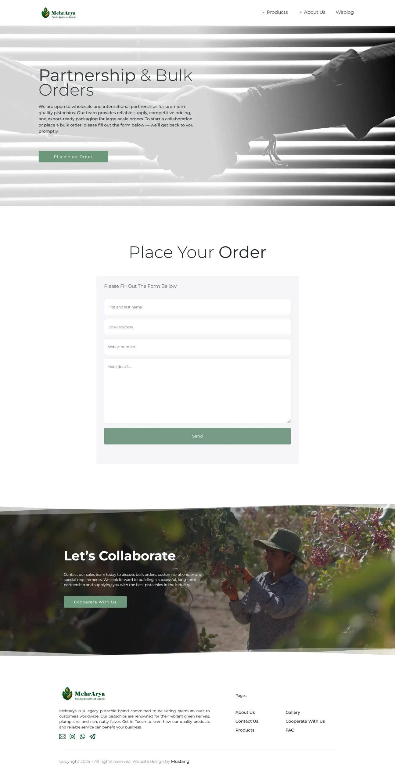 سایت مهرآریا بهعنوان تولیدکننده و صادرکنندهی برتر پسته، با طراحی مدرن و کاربرپسند، تجربهای دلنشین از خرید و آشنایی با محصولات پسته را برای کاربران فراهم میکند. در این وبسایت، بازدیدکنندگان میتوانند بهراحتی با انواع محصولات، فرآیند تولید و اطلاعات صادراتی آشنا شوند و با طراحی واکنشگرا، تجربهای یکپارچه در دستگاههای مختلف، از موبایل تا دسکتاپ، داشته باشند. هدف این طراحی، ارائهی تصویری حرفهای از برند مهرآریا و افزایش اعتماد مشتریان داخلی و بینالمللی به کیفیت محصولات بوده است.